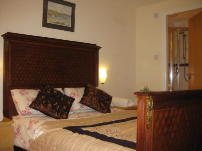 Master bedroom: double bed, armchair and reading lamp, fitted wardrobes and en suite: shower, basin, wc.